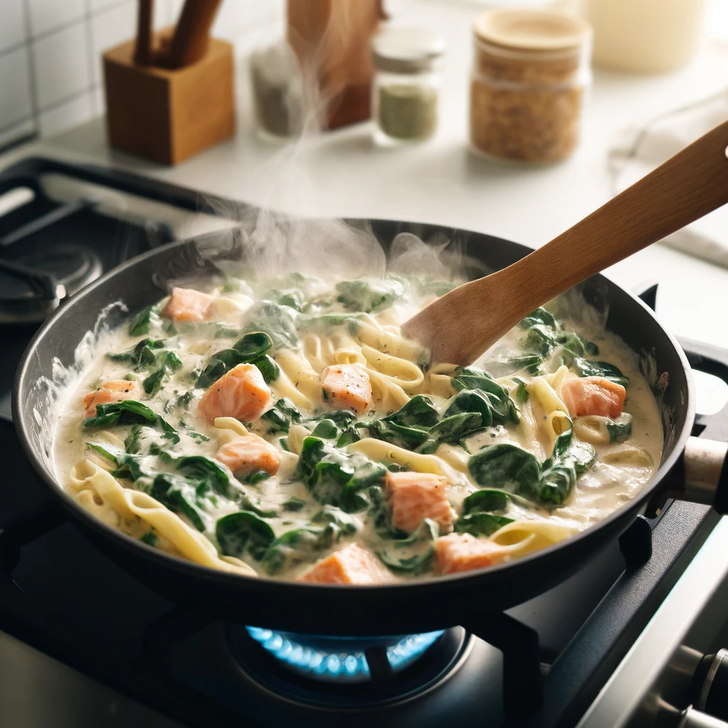 ④ほうれん草を加え、しんなりするまで炒めたら、生クリームと牛乳を加えて軽く煮込む。