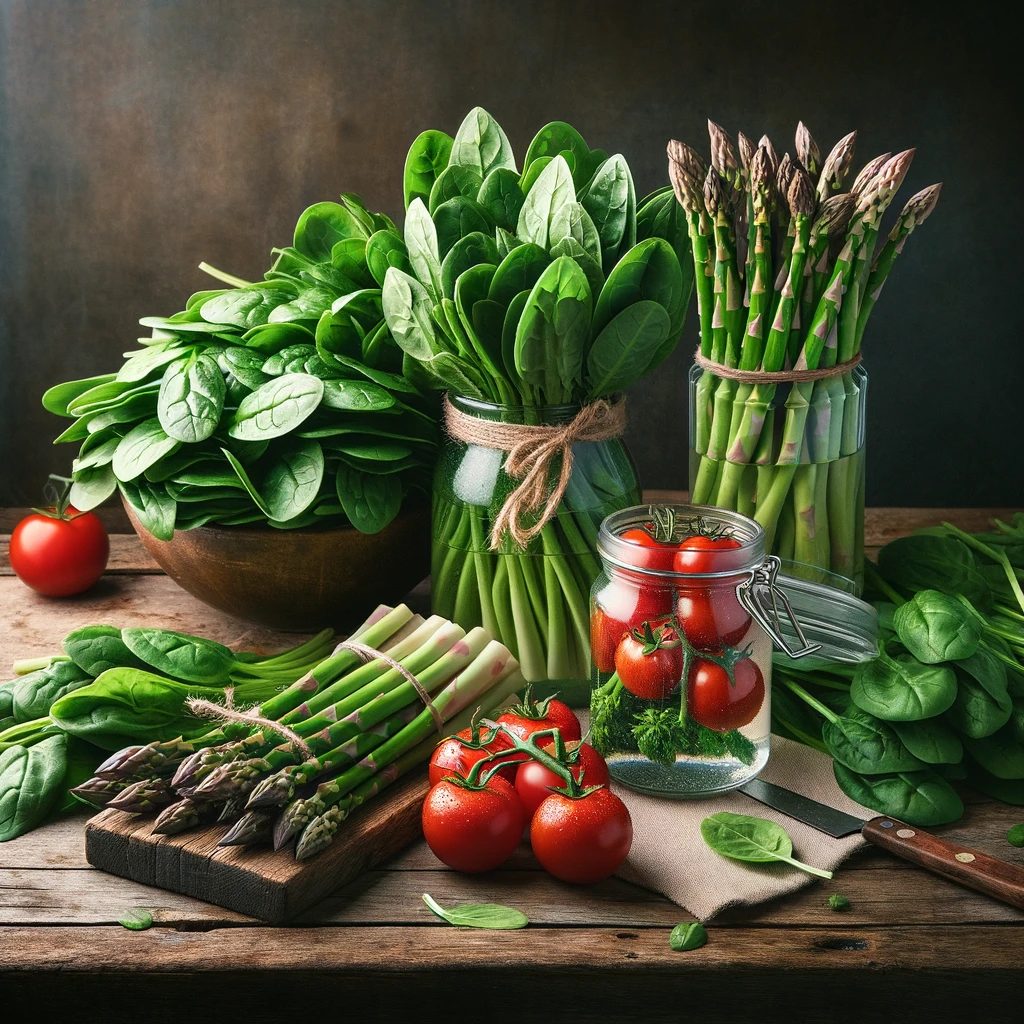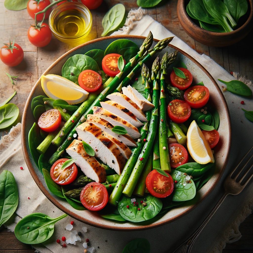 鶏胸肉はたんぱく質が豊富で低脂肪、春野菜はビタミンとミネラルをたっぷり含んでいます。特にほうれん草とアスパラガスは鉄分とビタミンEが豊富で、妊活中の栄養補給に最適です。