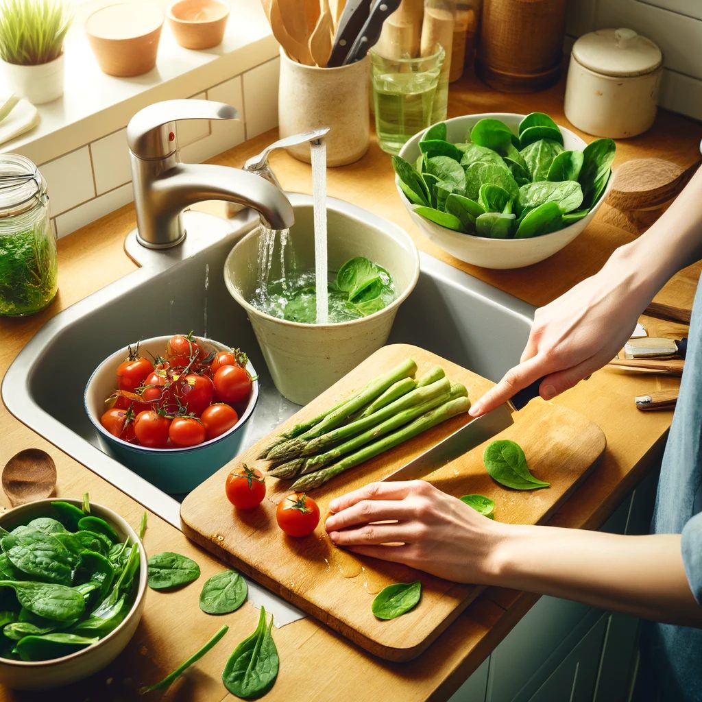 ②ほうれん草とアスパラガスはゆでて冷水で冷ます。アスパラガスは食べやすい長さに切る。