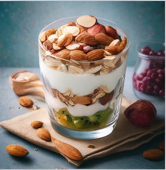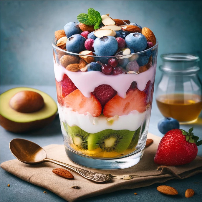 ヨーグルトでたんぱく質とカルシウムを、アーモンドでビタミンEと亜鉛を豊富に摂取できるデザートです。フルーツからはビタミンAとビタミンCを補給。栄養バランスが取れていて、甘さも自然で妊活に最適です。