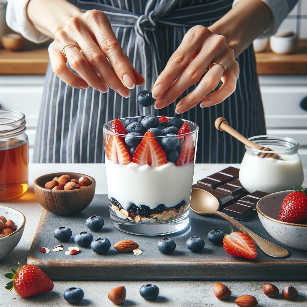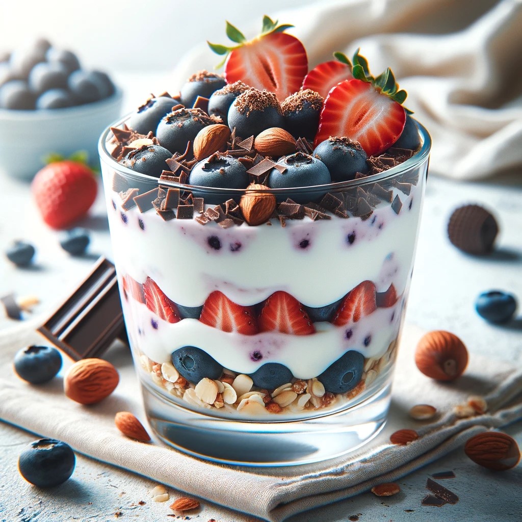このヨーグルトパルフェは、ビタミンと抗酸化物質が豊富なベリーとナッツを使った、栄養満点のデザートです。ビタミンCとEを多く含むブルーベリーといちごを使用し、アーモンドとヘーゼルナッツでさらにビタミンEと健康的な脂質を加えます。腸内環境を整えるプロバイオティクスが豊富なギリシャヨーグルトをベースに使用しています。
