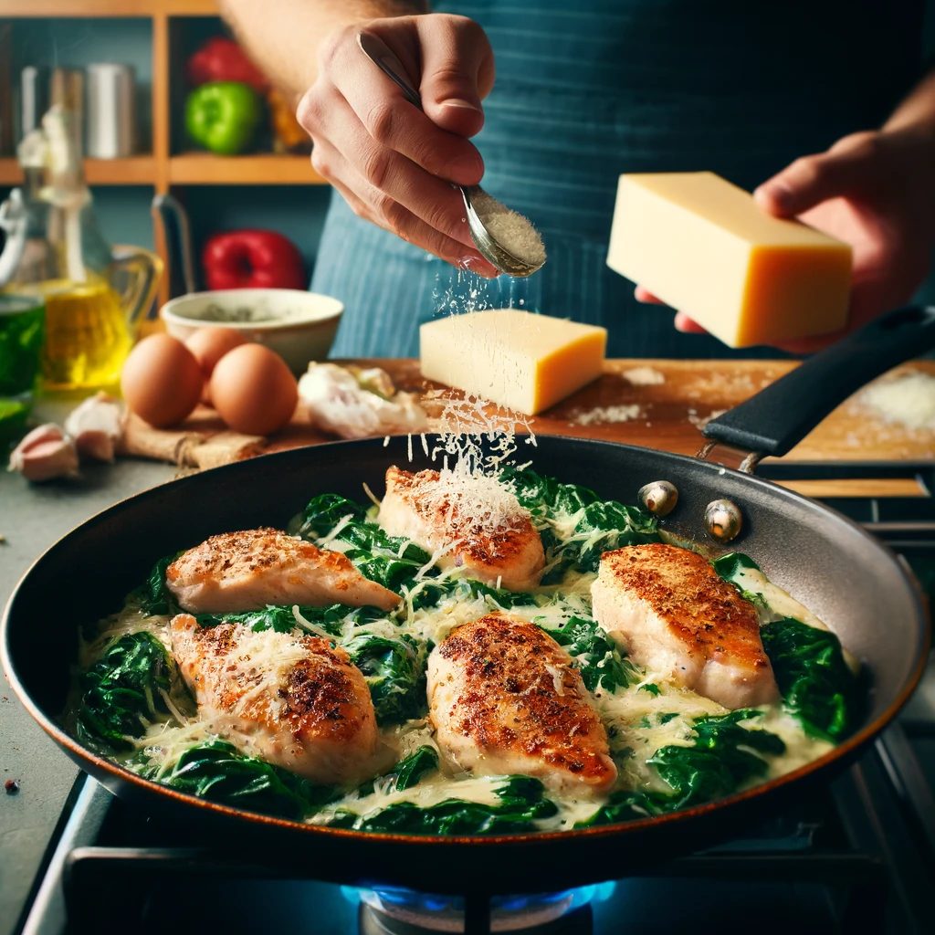 ⑤ 鶏肉とほうれん草の上にパルメザンチーズを均等に振りかけ、オーブンでチーズが溶けるまで焼く(約200度で5分)。
