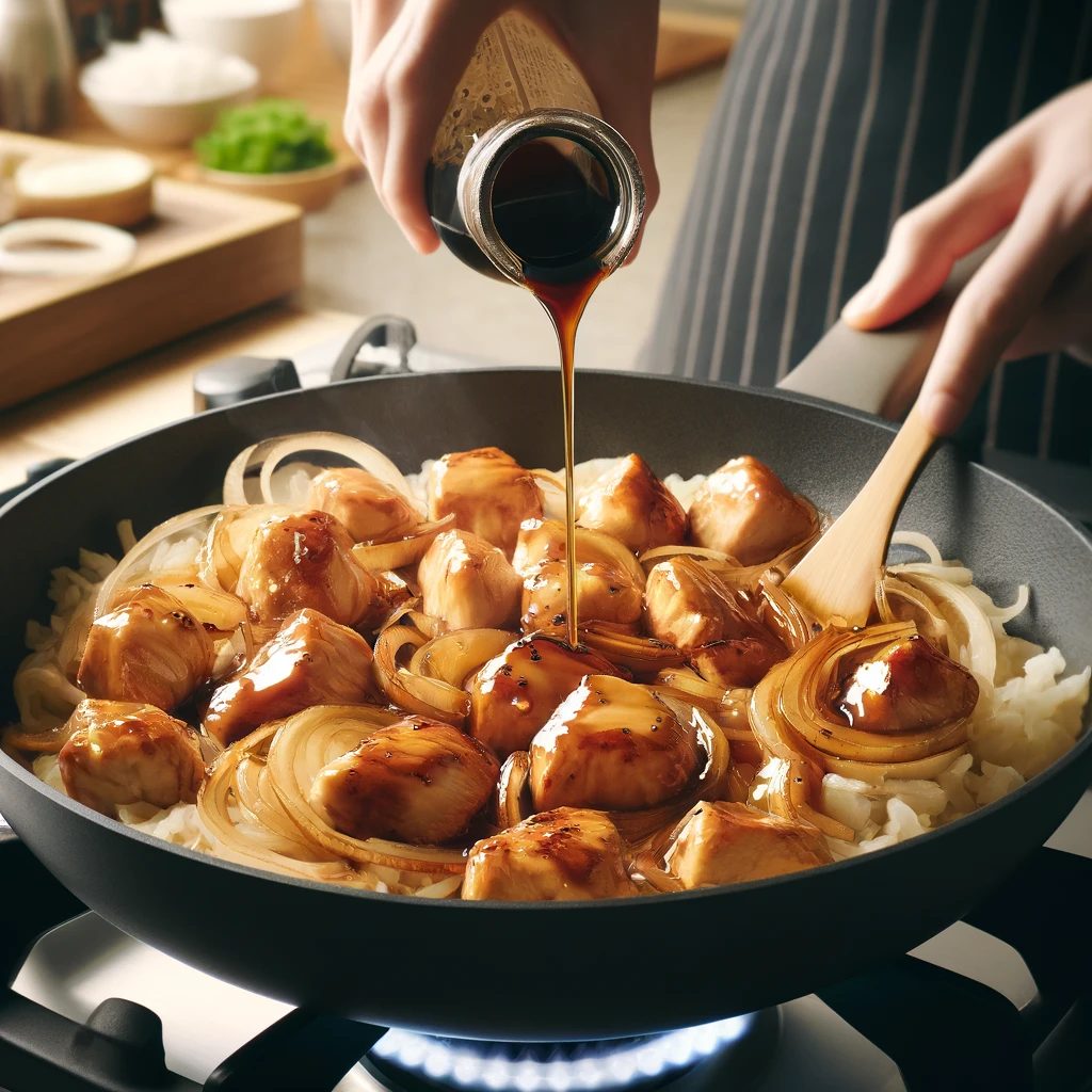 ③ 鶏肉がほぼ焼けたら、醤油、みりん、砂糖を加えて絡めながら強火で炒め、照りを出す。