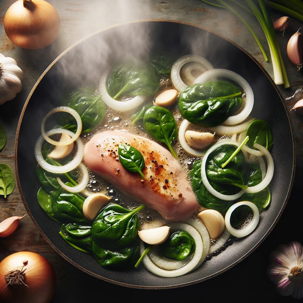 ⑤鶏むね肉に火が通ったら、ほうれん草を加えてさっと炒める。