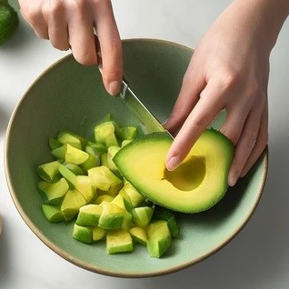 ②アボカドは種を取り除き、食べやすい大きさに切る。