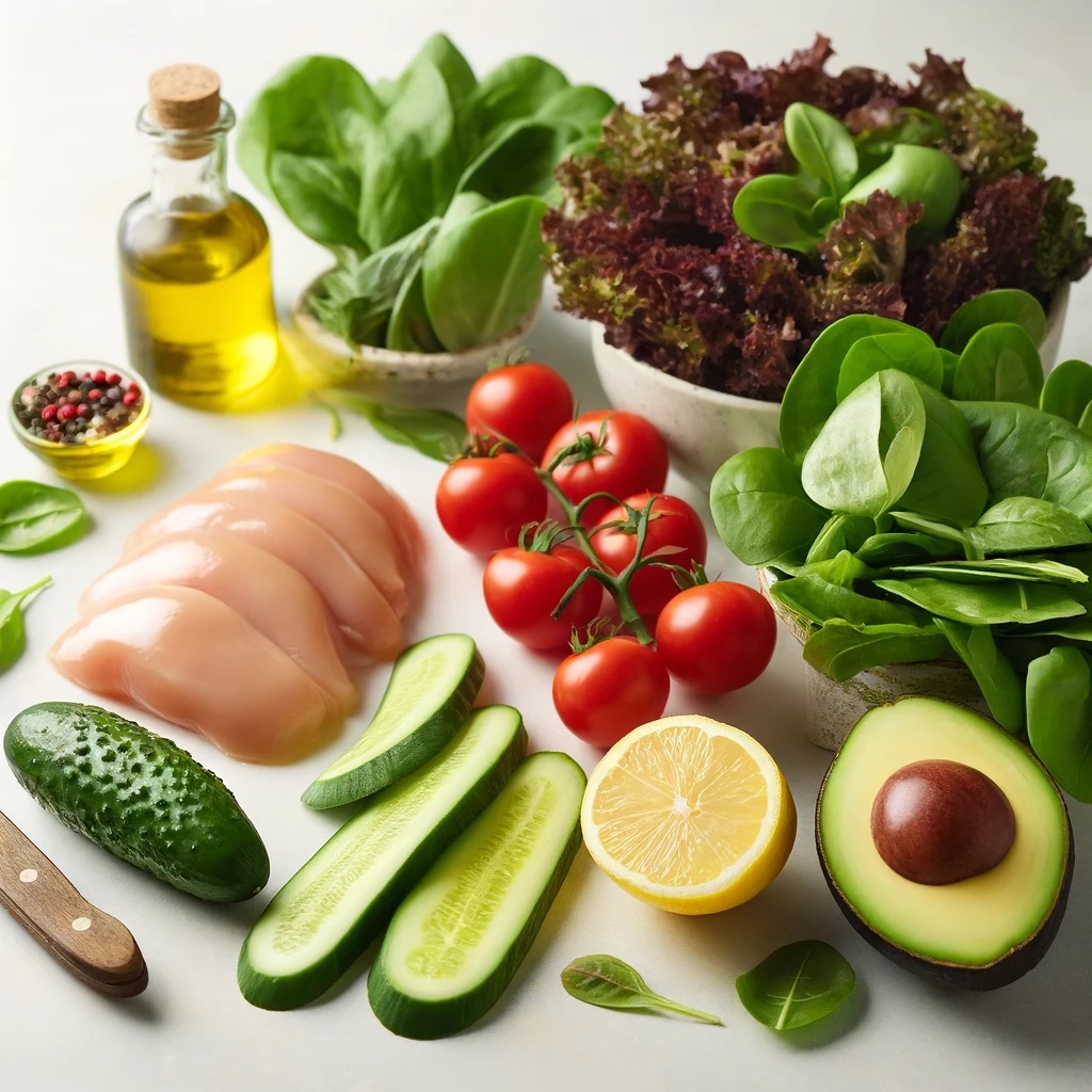 ④ボウルにベビーリーフ、ミニトマト、キュウリ、アボカド、ほぐした鶏ささみを入れる。