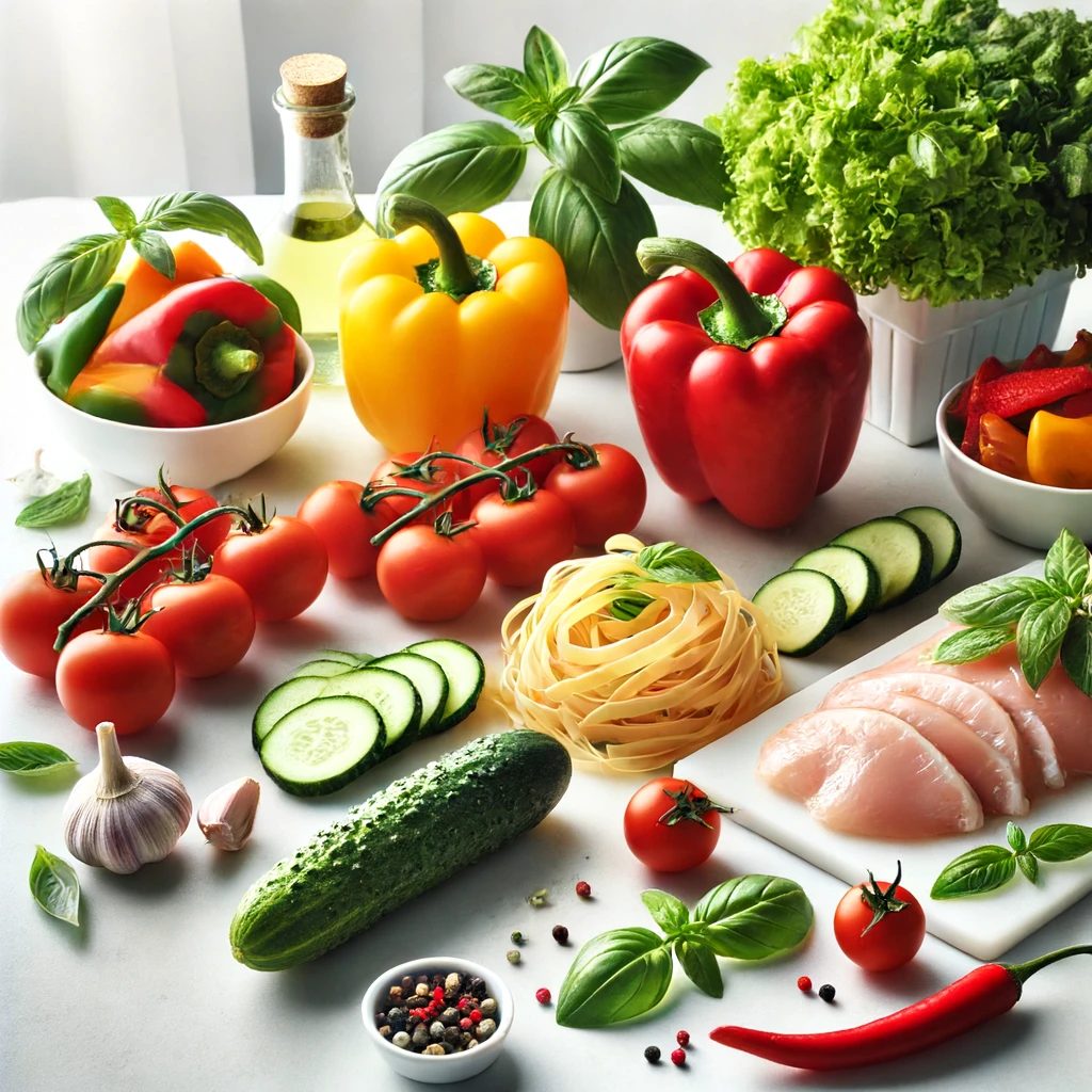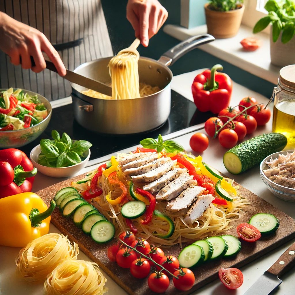 たっぷりの夏野菜と鶏ささみを使った冷製パスタです。たんぱく質やビタミン、ミネラルを含む食材を使用していますので、バランスの良い食事におすすめです。