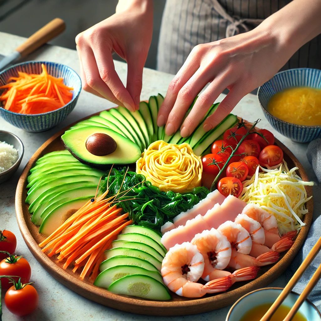 ⑦そうめんを皿に盛り付け、鶏むね肉、エビ、野菜、錦糸卵、アボカドを彩りよくトッピングします。
