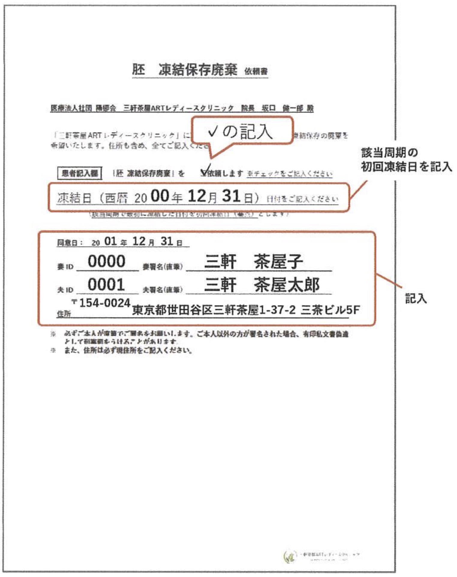 凍結保存の更新をご希望されない方も書類のご提出が必要となります。「廃棄依頼書」をご記入後、当院窓口(予約必須)か郵送にてご提出ください。