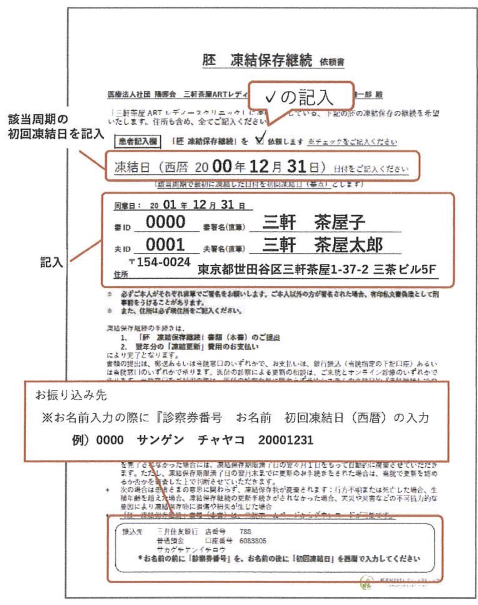また、複数の周期にわたって胚(受精卵)、SEET液、卵子を凍結した場合や、複数回(凍結日が異なる)精子を凍結し保管されている場合は、それぞれに関して更新・廃棄のお手続きが必要となります。