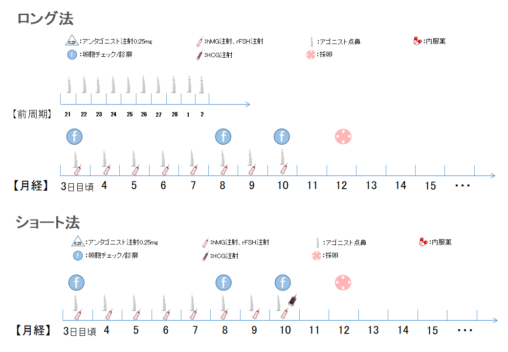 当院では卵巣の予備能が良い方にLong法を、予備能が低下、FSHが高い方にはshort法を用いています。月経3日からHMG/FSH製剤を開始します。月経8、10日目に経膣超音波法により卵巣内で発育する卵胞数と卵胞の大きさを計測します。また血液中のE2(エストロゲン)を測定します。卵胞経過が約20mmに発育し、卵胞1個あたり200pg/ml程度になったら夜の10-11時頃にHCGというホルモンを注射します。HCG投与後36時間で排卵が起こります。排卵直前、HCG投与後34-36時間8時30分―9時ころに採卵を行います。
