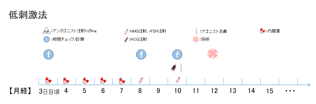 卵巣機能が低下してFSHが上昇していたり、ロング、ショート、アンタゴニストにて回収できる卵が少ない方を対象に低刺激法を行っています。年齢が若く、卵巣が刺激に対して強く反応する場合は、しっかり刺激をして採卵数を多くし胚盤胞を確保することをお勧めしています。