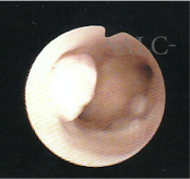 子宮筋腫(粘膜下筋腫) 不正出血や月経過多の原因となります。子宮ファイバーで内腔に突出する病変を確認できます。