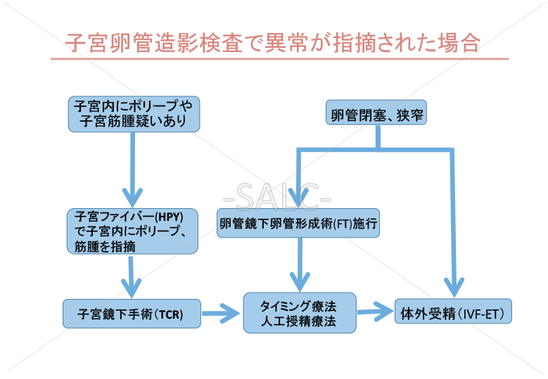 子宮卵管造影検査(HSG)で①②があった場合、自然妊娠は難しいと判断され体外受精へステップアップを勧められることがあります。今後の方針は以下の通りです。フローチャートのように体外受精にまだステップアップされない場合は、卵管鏡下卵管形成術(FT)を行います。
