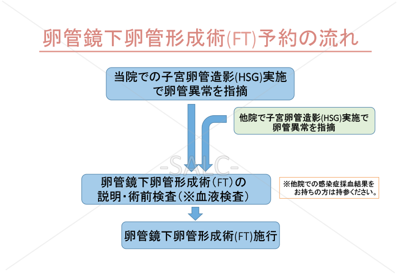 当院では積極的にFT手術を推奨しております。他院で卵管造影や卵管通水試験を行って異常を指摘さらた患者様は、是非一度、ご相談ください。最短で受診1-2日後に手術を計画することができます。他院で感染症採血を1年以内に受けられてた方は、結果のコピーを持参いただければ、再度感染症採血は不要です。またFTをする周期であってもそのままタイミングや人工授精は実施できます。