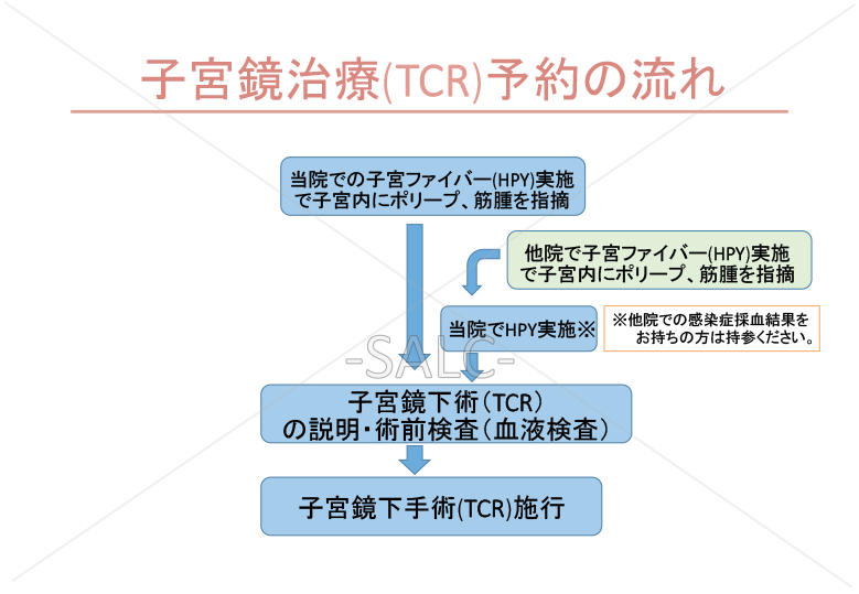 当院では積極的にTCR手術を推奨しております。他院で子宮筋腫や内膜ポリープを指摘さらた患者様は、是非一度、ご相談ください。その場合は、再度当院で子宮ファイバー検査を実施いたします。他院で感染症採血を1年以内に受けられてた方は、結果のコピーを持参いただければ、再度感染症採血は不要です。