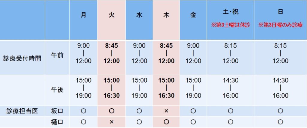 木曜日の診療開始に伴い、火曜日の診療受付時間も変更になりますので、ご予約の際はお気を付けください。