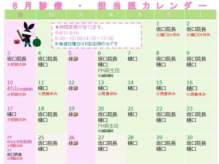 8月診療カレンダーのお知らせ