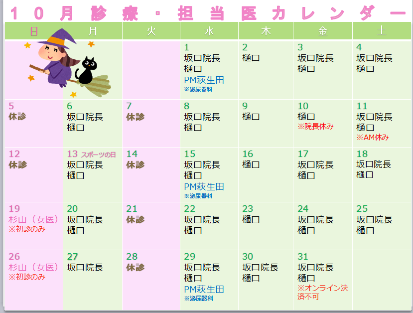 10月診療担当医カレンダー